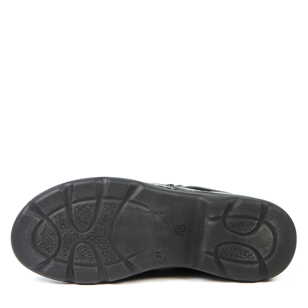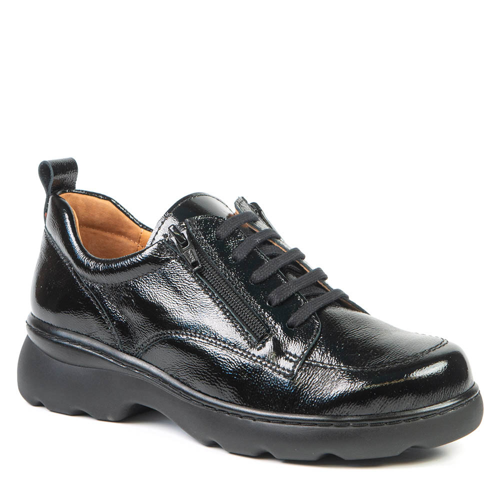 Add a bold touch to your outfits with this black patent leather shoe featuring a sporty sole. Easy to slip on with a side zipper, it offers great support and accommodates orthotics thanks to its removable insole. A perfect choice for women looking for comfort and originality in everyday wear.