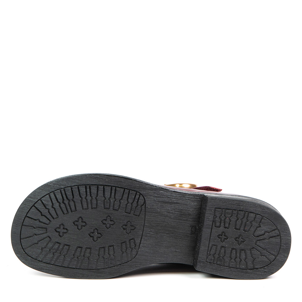 This burgundy Mary Jane-style leather flat blends retro charm with modern comfort. The adjustable velcro strap with a gold buckle adds an elegant touch and ensures a secure fit. With its removable insole, it allows the use of orthotics for personalized comfort. Perfect for everyday wear, work, or outings.