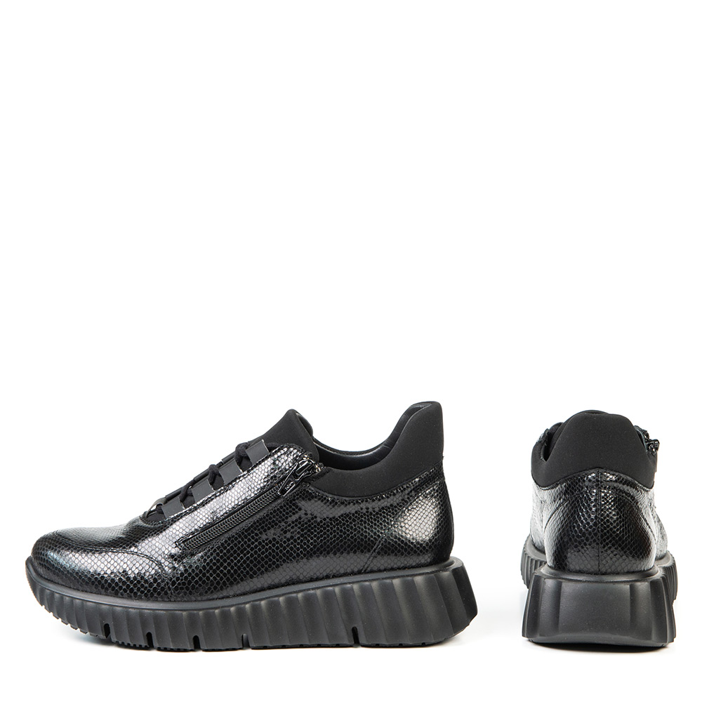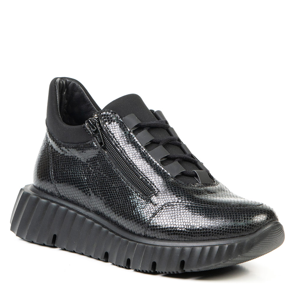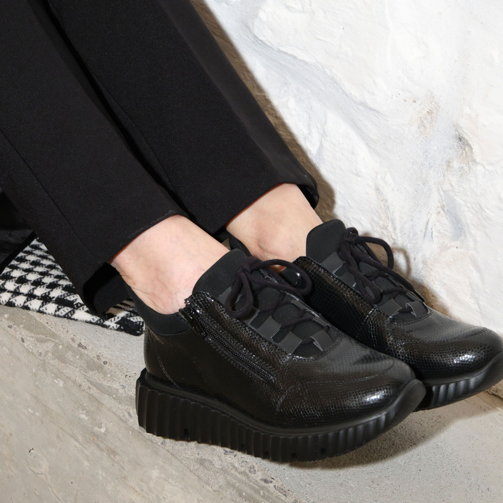 Show off your style with this bold black patent leather shoe featuring a modern chunky sole. Its side zipper and laces make it easy to slip on, while the removable insole allows the use of orthotics. A trendy and comfortable option for active women.