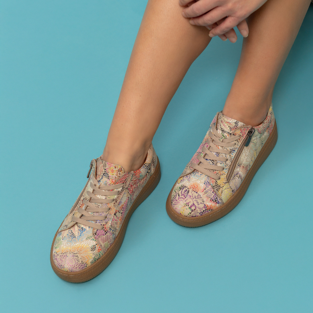 This multicolor shoe adds a fresh and distinctive touch to your everyday outfits. The lace-up design ensures a secure fit, while the side zipper allows for easy on-and-off and simplifies orthotic insertion. The removable footbed provides excellent comfort for both orthotic wearers and those who do not wear orthotics. A comfortable and stable style designed for daily wear.