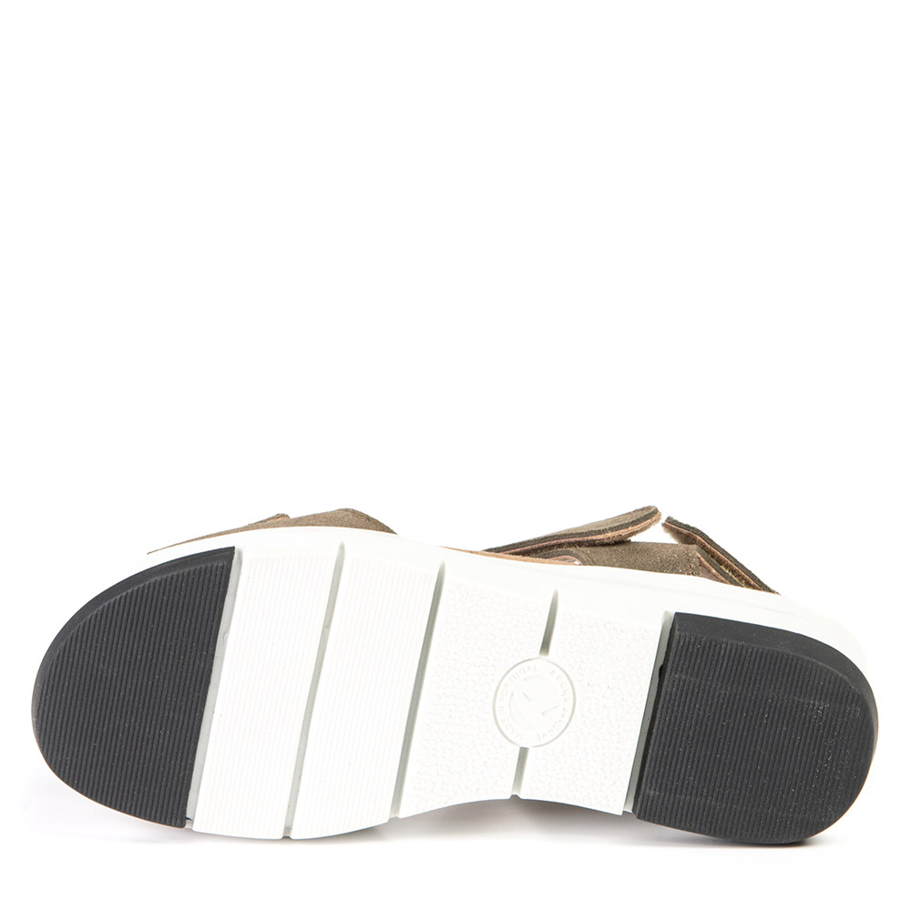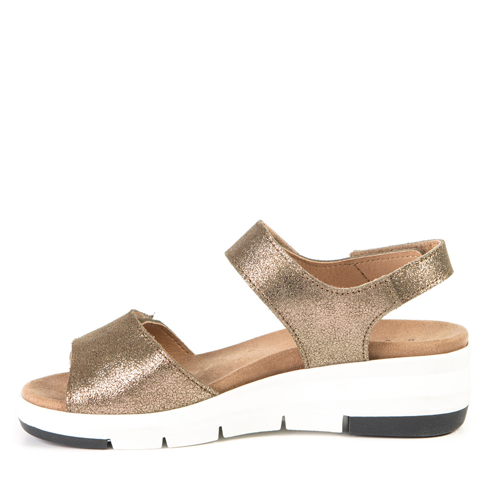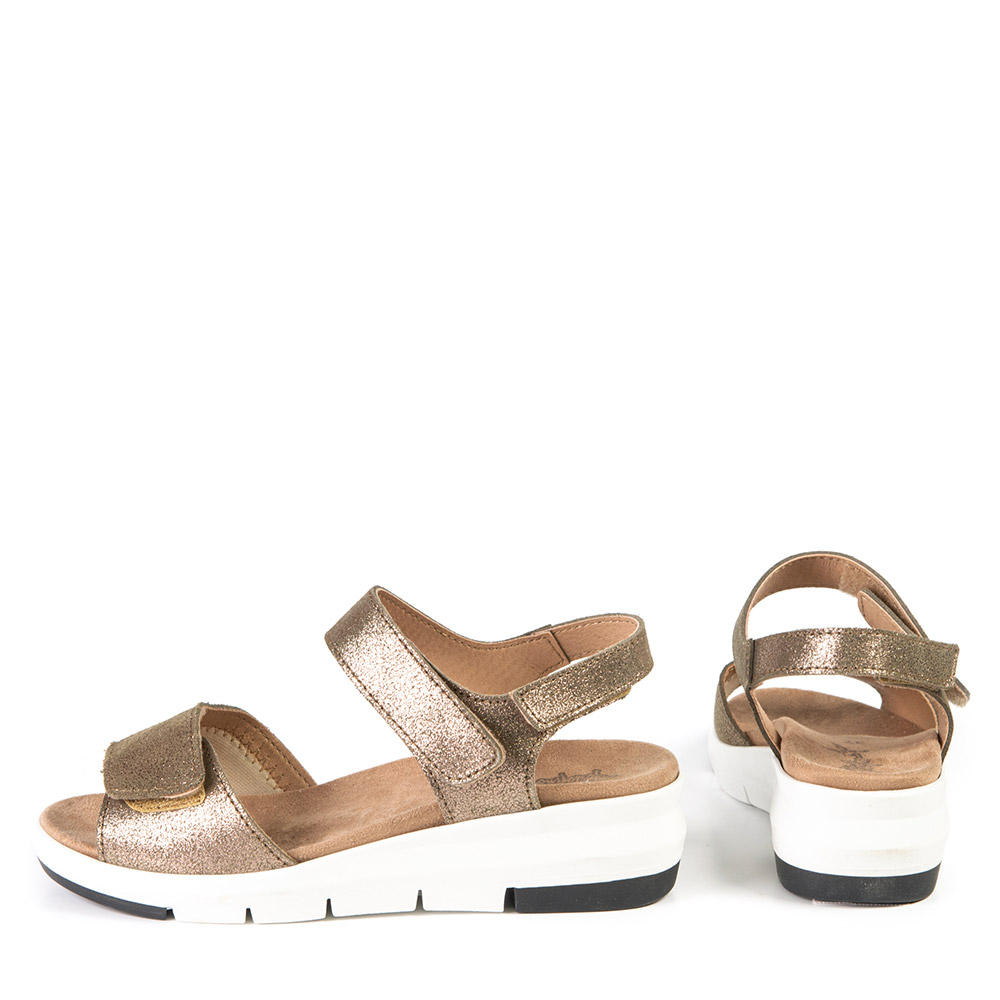 Embrace the trend of metallic colours with this beautiful golden sandal. The three Velcro straps are adjustable to your comfort.