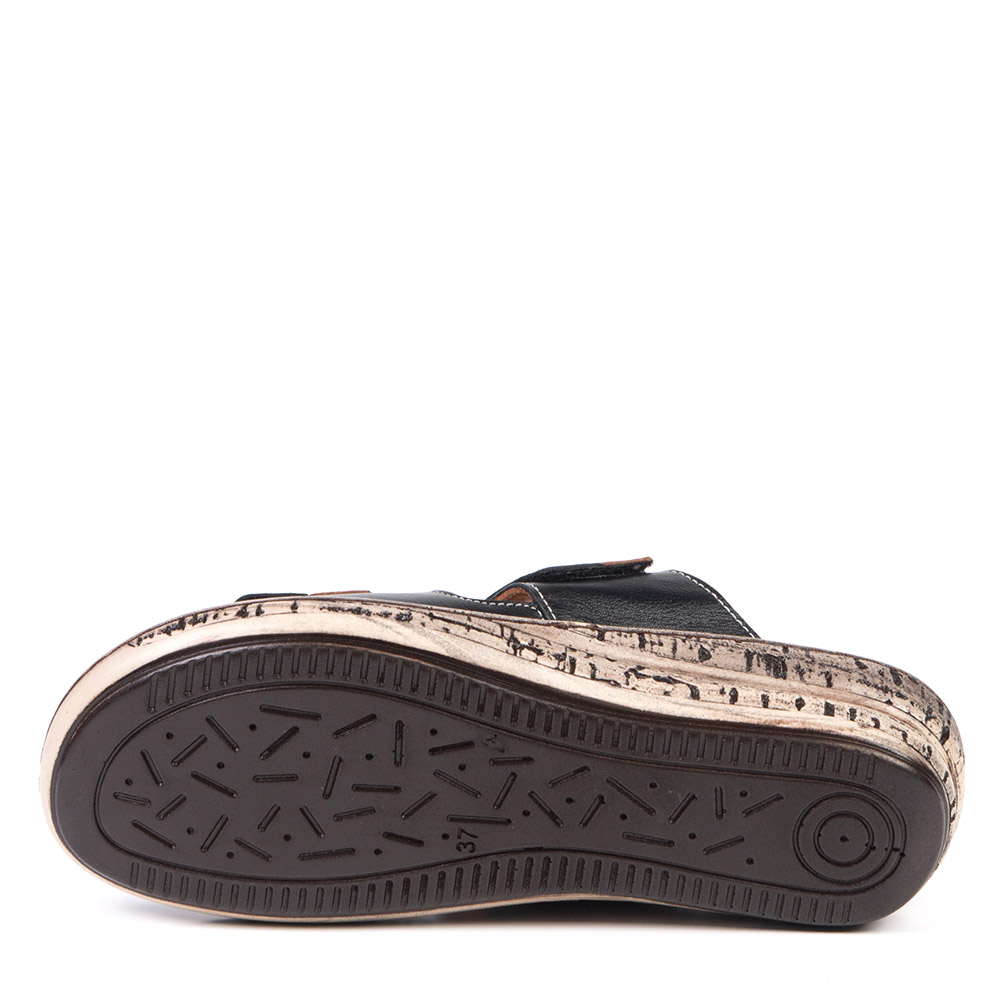 Slip on sandal with a wedge sole that accommodates orthotics thanks to the removable insoles. Adjust it to your comfort with the two velcro straps.