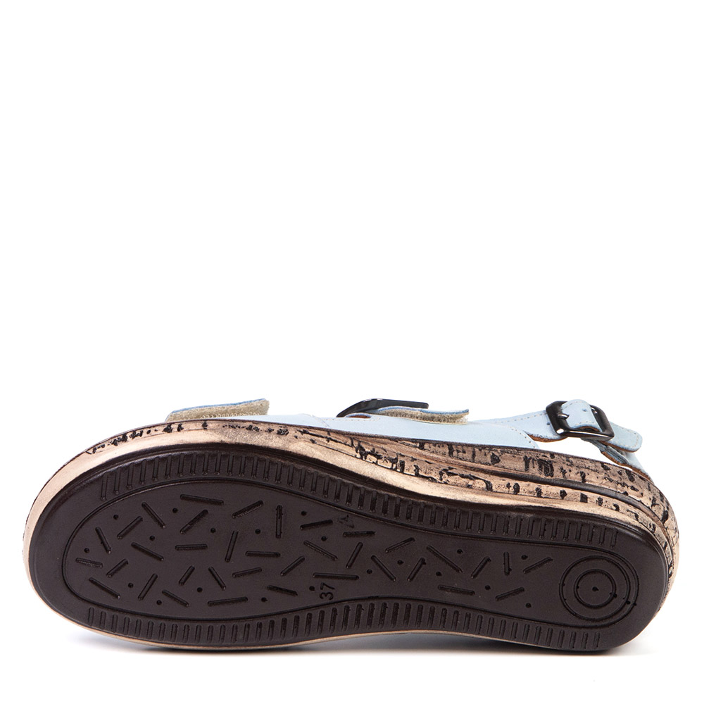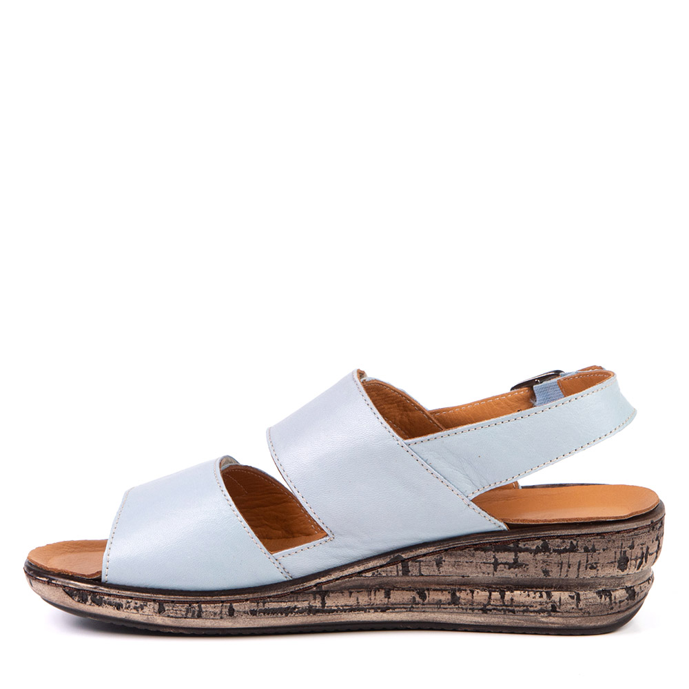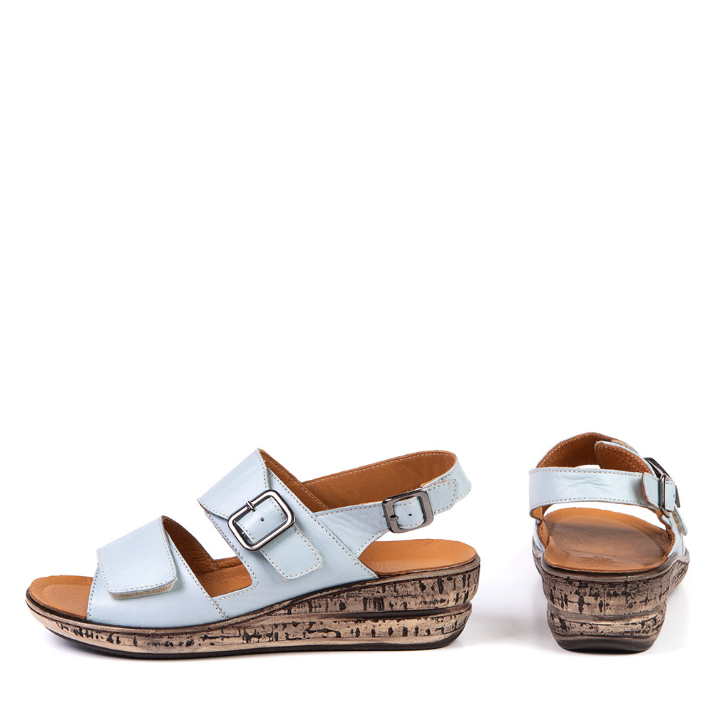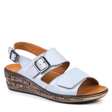 Chic blue sandal with a wood-like sole that accommodates orthotics thanks to the removable insoles. Adjust it to your comfort with the two velcro straps.