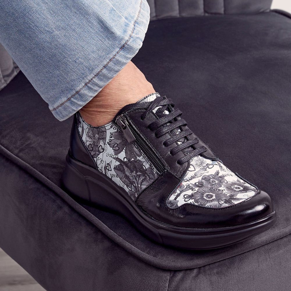 Discover the perfect fall shoe that will elevate your wardrobe with its trendy sole and nice print. Experience the convenience of easy insertion with two zippers and laces, while accommodating orthotics with a removable insole. Make it your top choice for comfort and style this season!