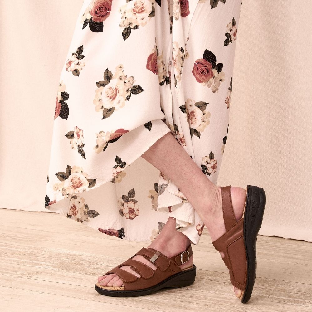 Cette sandale tan à velcro vous offre un ajustement à votre confort grâce aux multiples courroies en plus d'apporter une certaine délicatesse à votre pied grâce aux jolis ornements.