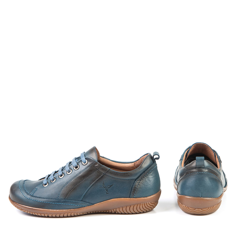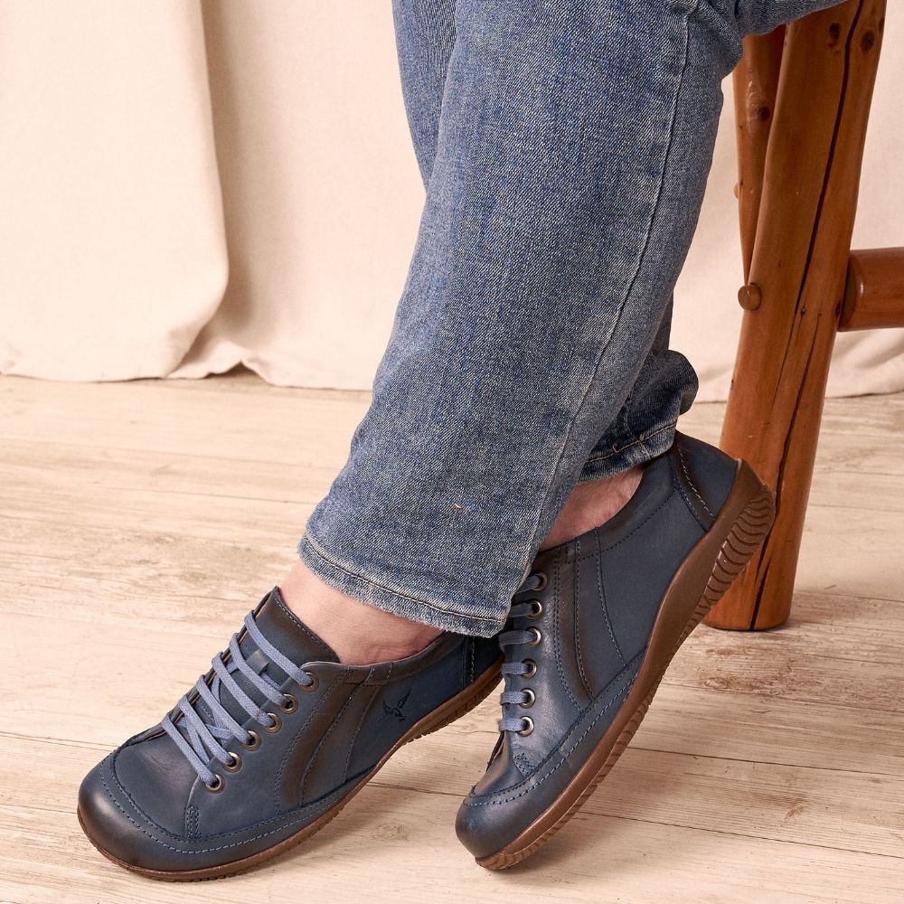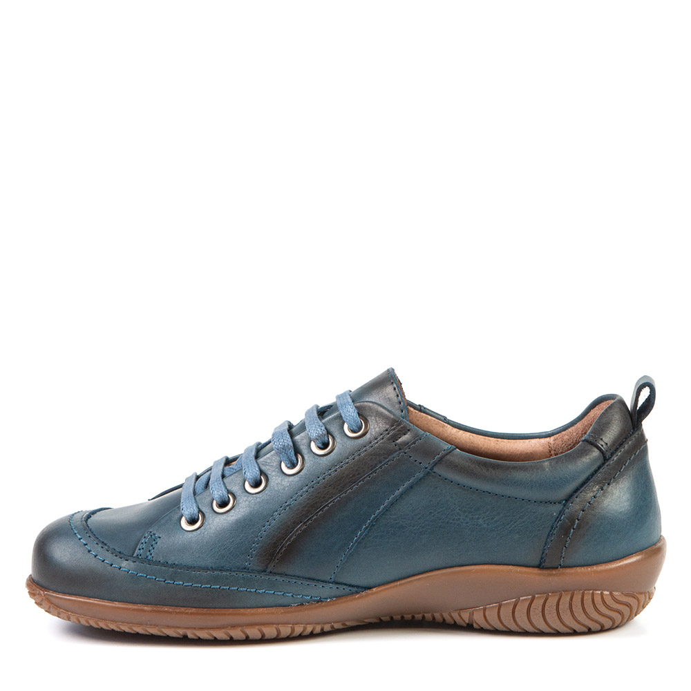 Ce soulier lacé bleu fait de cuir est large, possède une grande ouverture et permet l'insertion d'orthèses. Ce modèle classique perdurera dans le temps! Son confort vous surprendra.