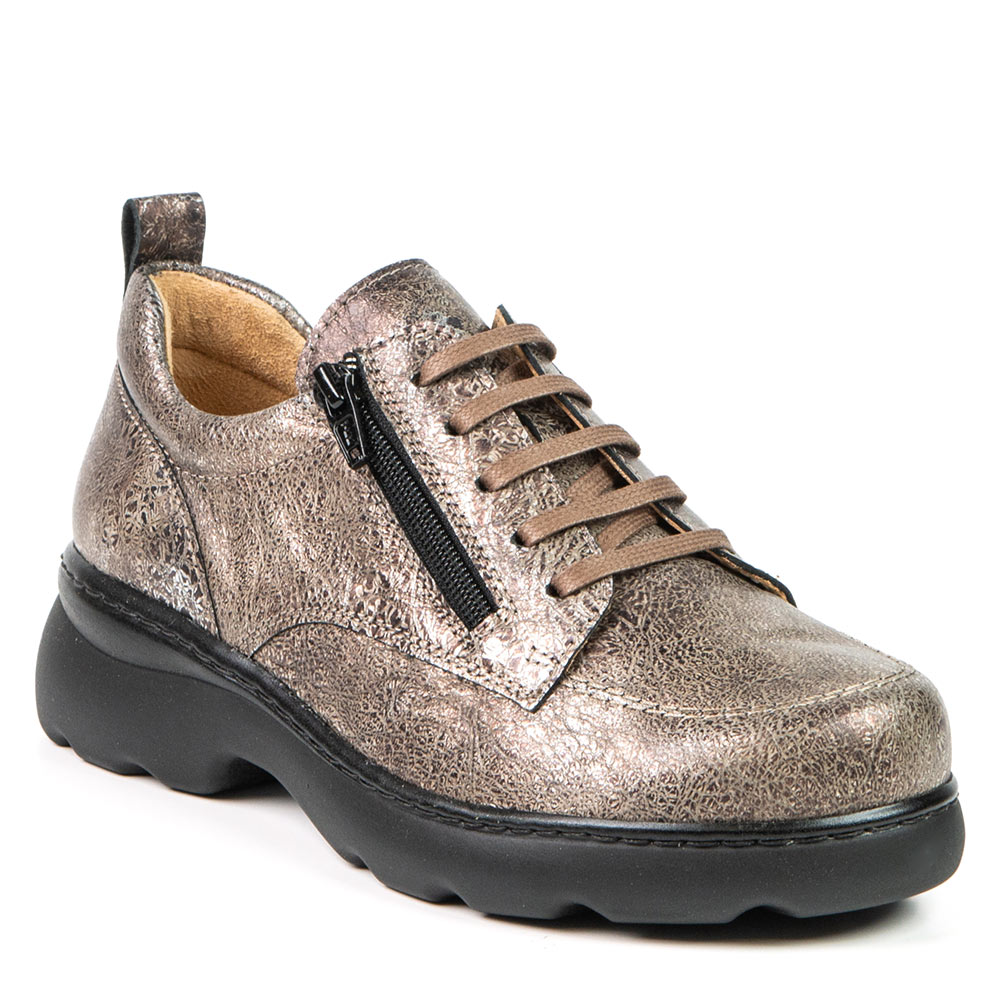Apportez une touche audacieuse à vos tenues avec ce soulier argent à la semelle sport. Facile à enfiler grâce à sa fermeture éclair, il offre un bon soutien tout en permettant l’insertion d’orthèses grâce à sa fausse semelle amovible. Un choix parfait pour les femmes recherchant confort et originalité au quotidien.