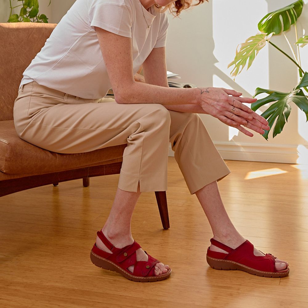Voici une jolie sandale rouge qui vous permettra un ajustement parfait au niveau de la cheville et du pied. Insérez-y votre orthèse en toute discrétion. La petite partie extensible et coussiné à l'intérieur de la sandale offrira un confort supérieur pour les dames avec des Hallux Valgus.