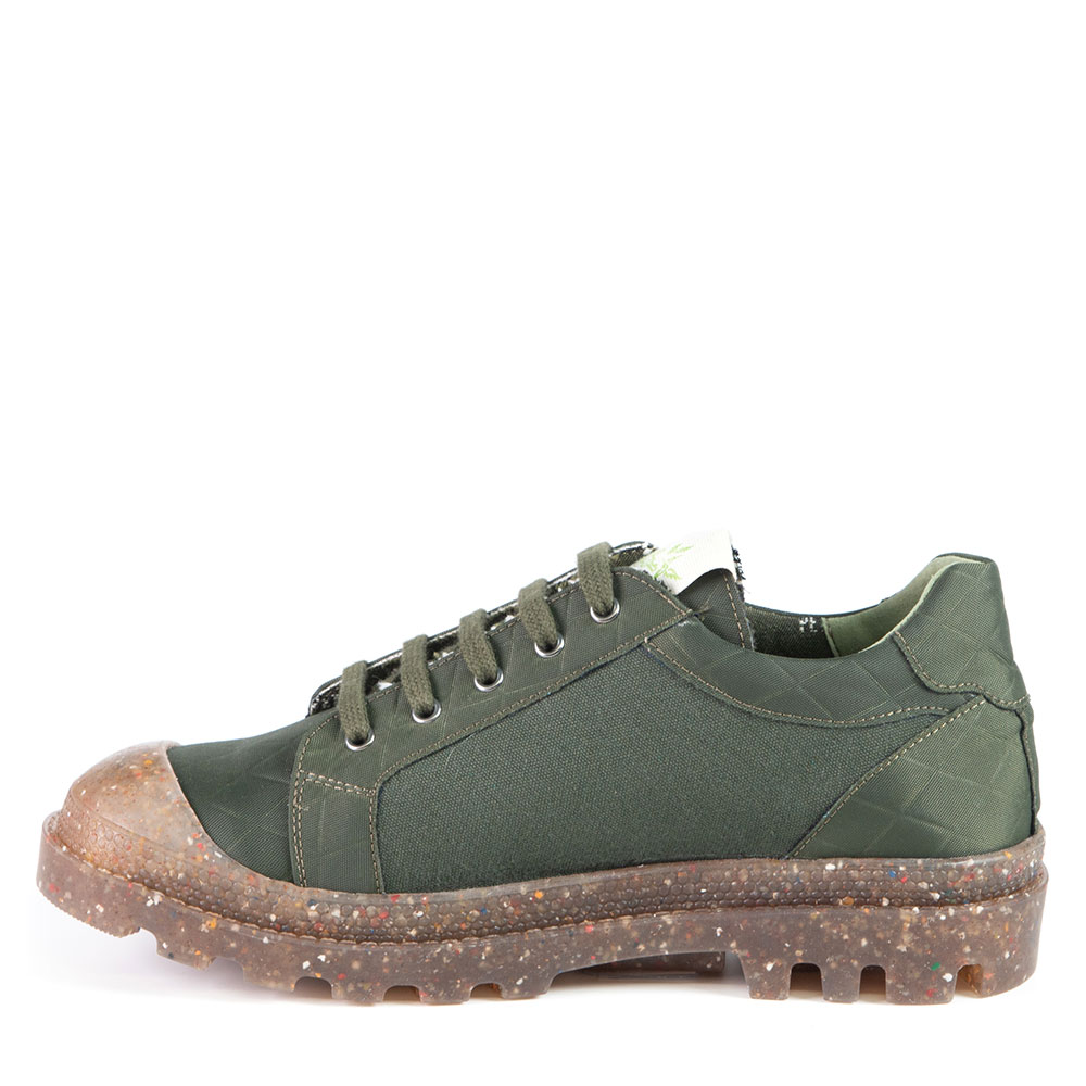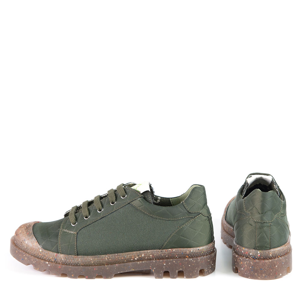 This shoe is entirely made from recycled materials. The soles of the shoes are crafted using a combination of recycled cork and rubber materials. As for the upper part of the shoes, it is constructed from recycled textiles sourced from excess production waste within the global fashion industry. Additionally, the materials include repurposed water bottles retrieved from the ocean or post-consumer usage.