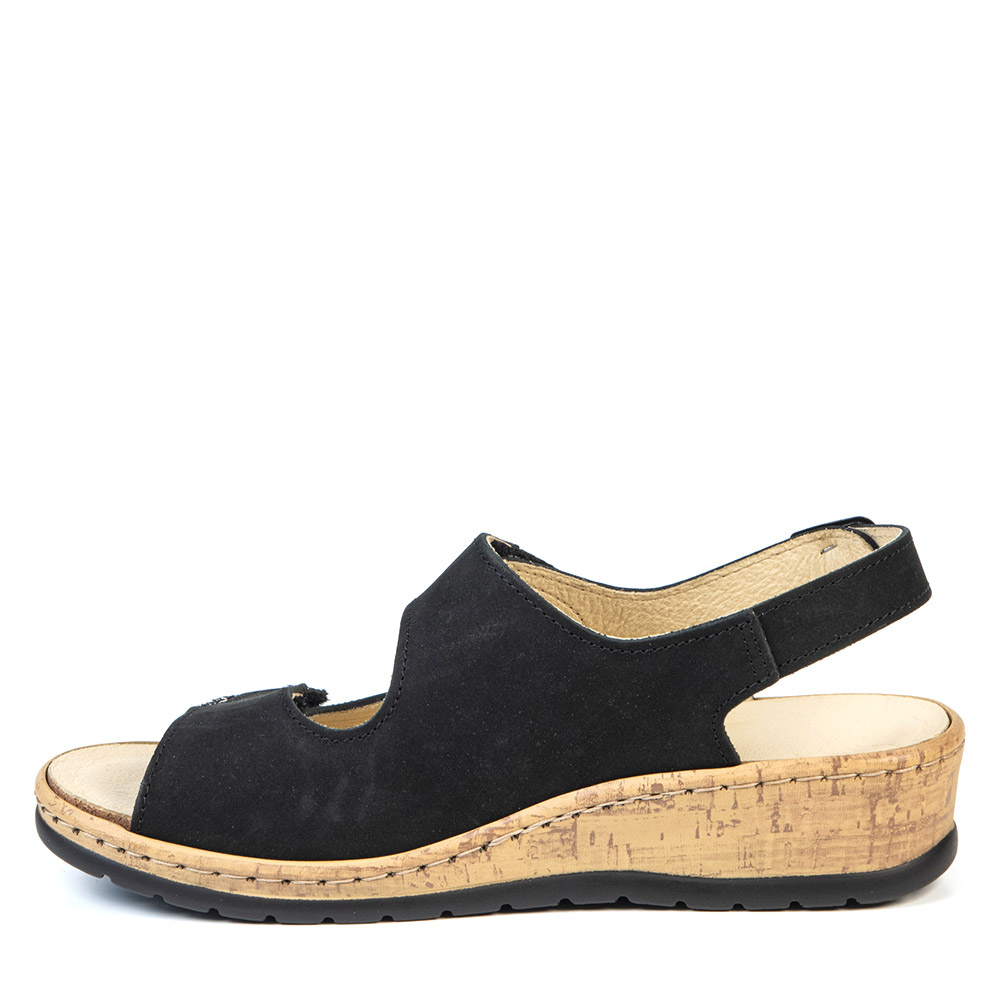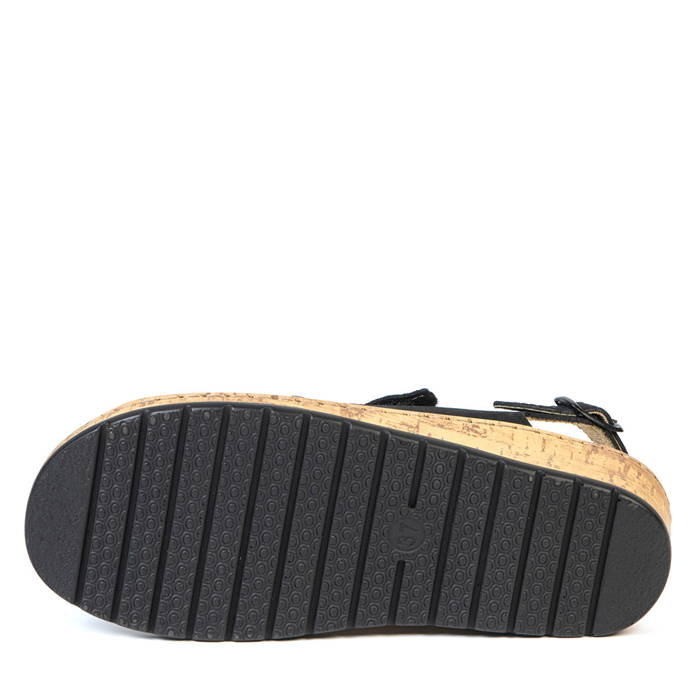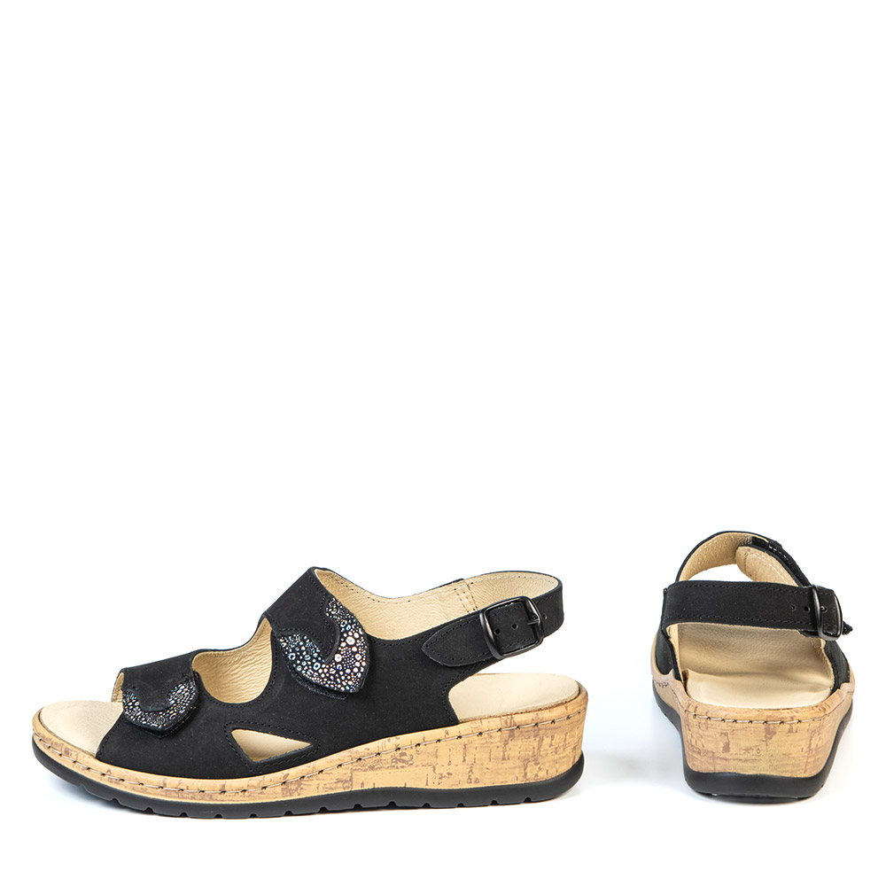 Sandale chic noire avec semelle imitation bois qui permet le port d'orthèses grâce aux fausses semelles amovibles. Ajustez-là grâce aux deux courroies de velcro.