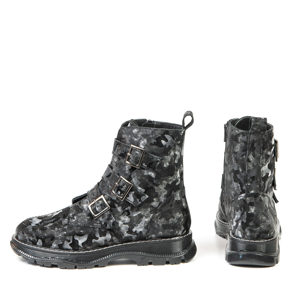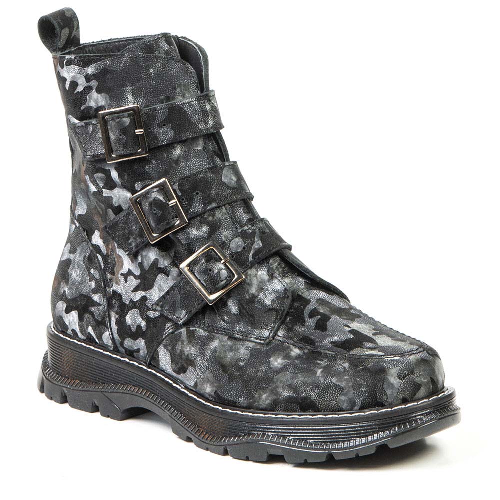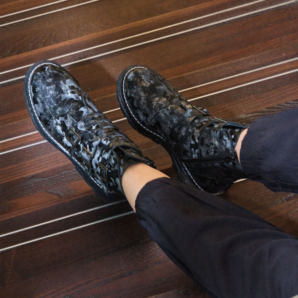 Affirmez votre style avec ce bottillon audacieux à motif camouflage. Ses trois boucles décoratives ajoutent une touche originale et urbaine, parfaite pour dynamiser vos tenues d’automne. Confortable et pratique, ce modèle est muni d’une fermeture éclair latérale et d’une fausse semelle amovible pour accueillir vos orthèses. Idéal pour les femmes qui recherchent style, maintien et confort au quotidien.