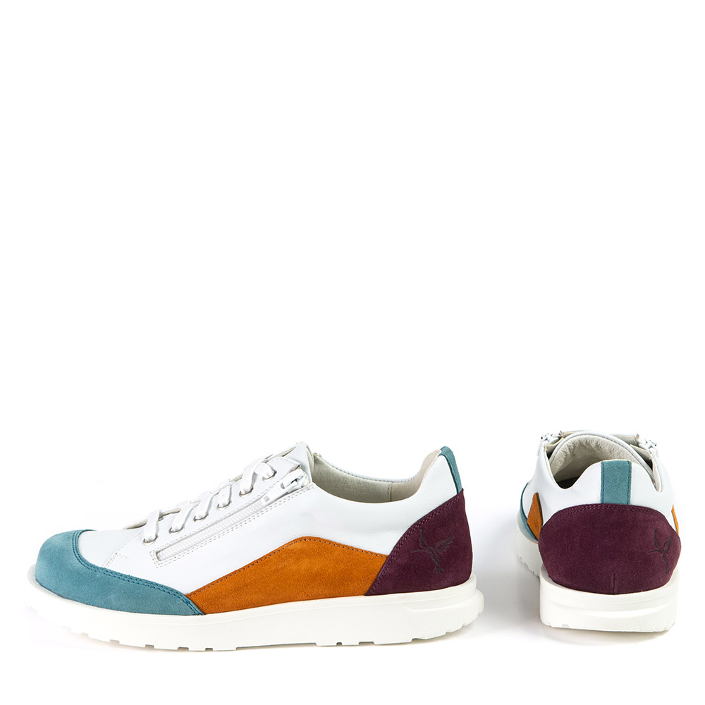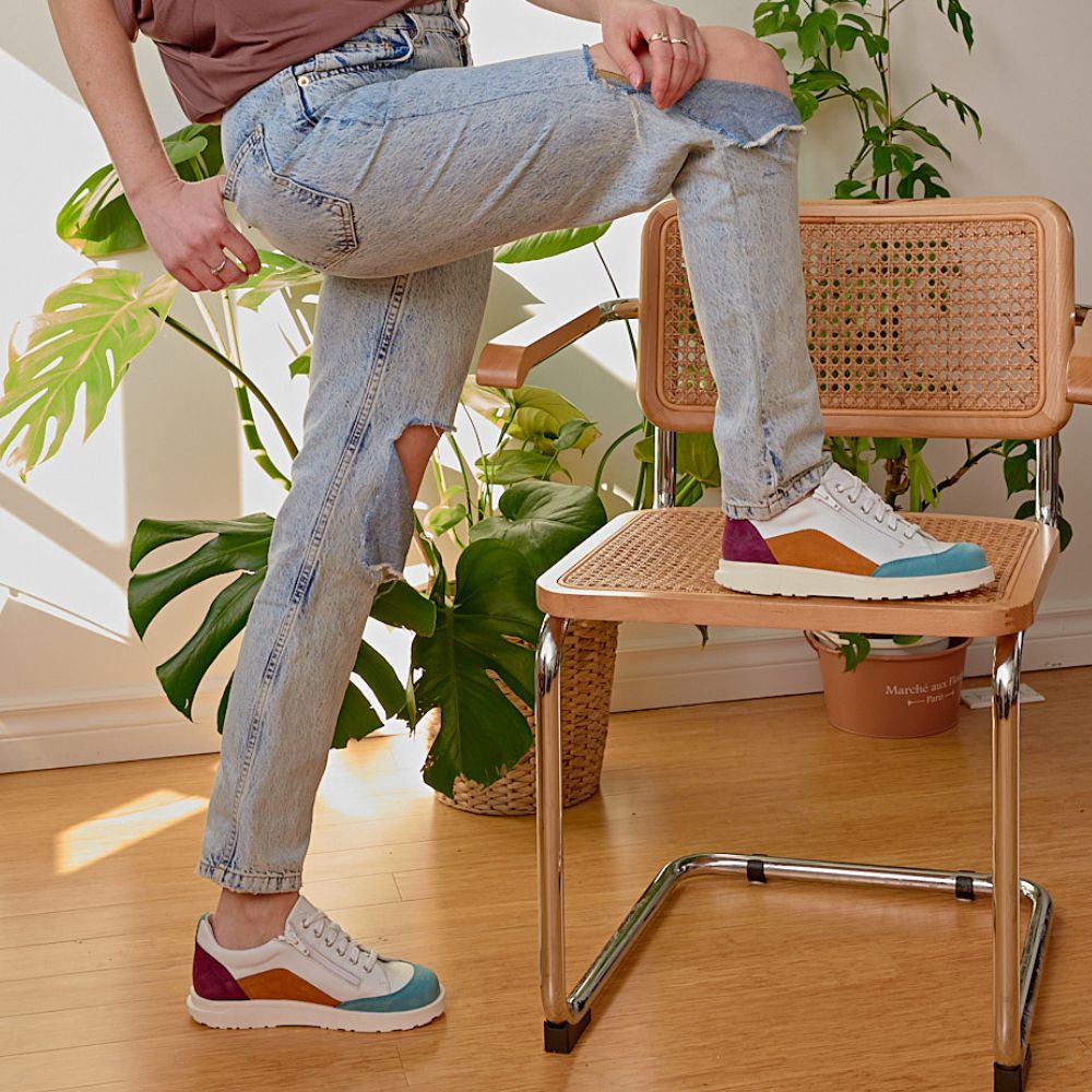 Cette espadrille colorée vous ravira par son confort et son look jeune. La fermeture éclair au dessus procure une insertion facile et rapide, en plus de pouvoir y insérer vos orthèses.